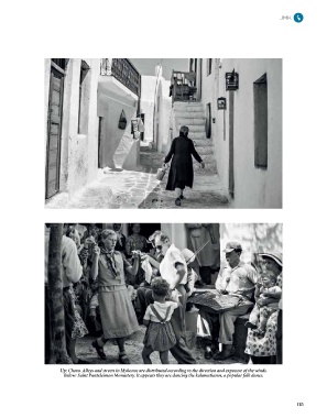 JMK Up: Chora. Alleys and streets in Mykonos are distributed according to the direction and exposure of the winds. Below: Saint Panteleimon Monastery. It appears they are dancing the kalamatianos, a popular folk dance. 131